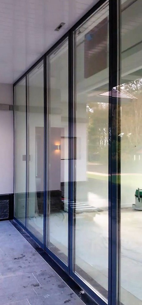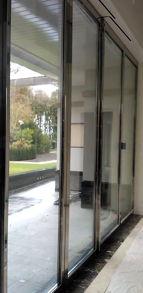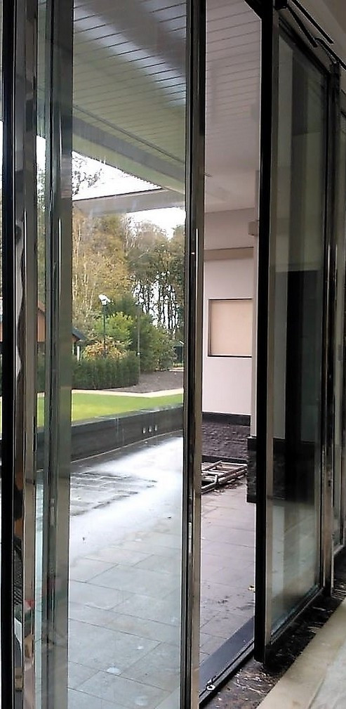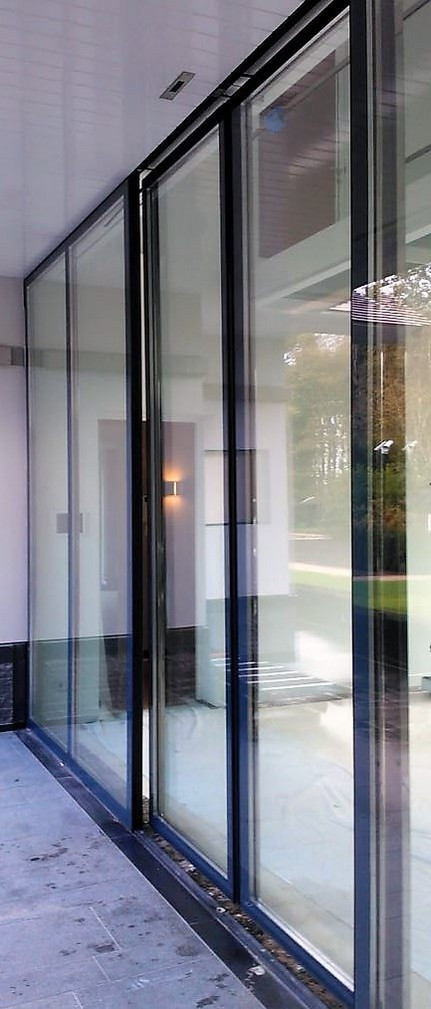 Bovenstaande pui is met inbraakwerend glas uitgevoerd. Aan de binnen zijde zijn de deuren bekleed met hoogglans gepolijst roestvaststaal en aan de buitenzijde is alleen glas te zien (het glas valt over de stijlen van de deur heen). Deze nieuwe generatie elektrisch bedienbare schuifdeuren noemen wij E-motion. Mede door de toepassing van speciaal ontwikkelde sloten voldoen deze deuren aan de weerstandsklasse WK3+ - WK4.