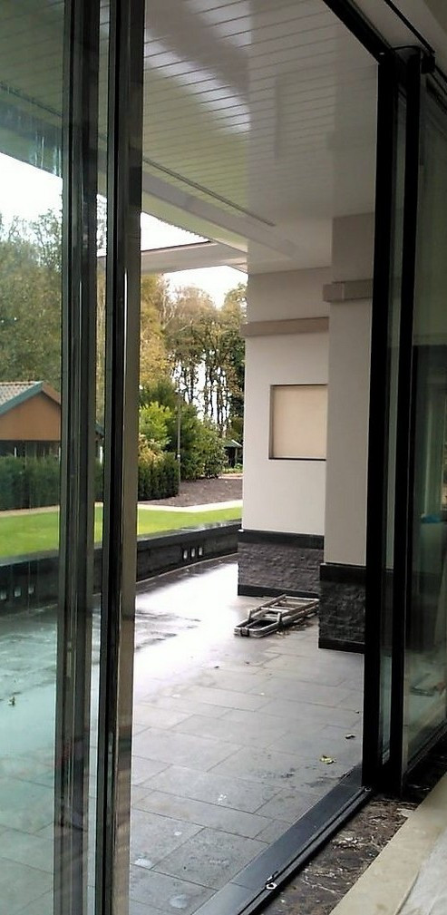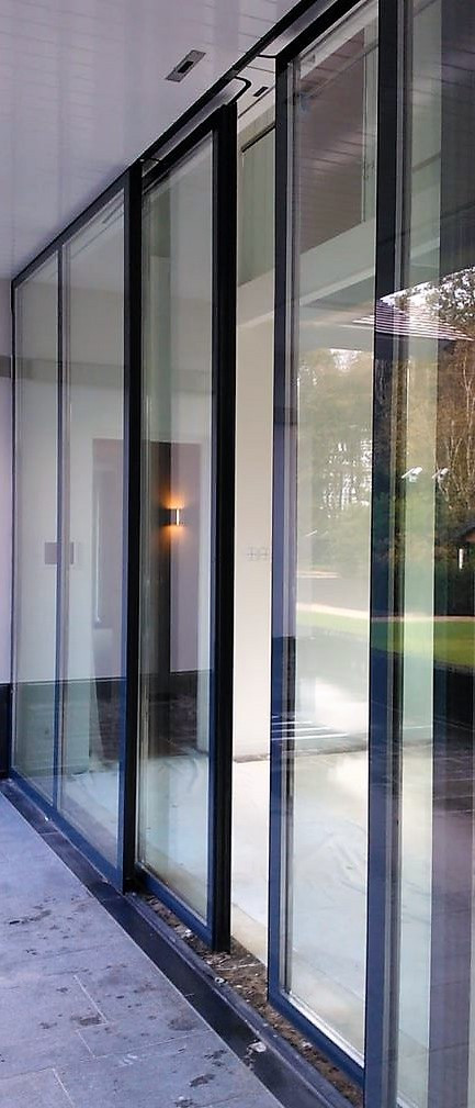 Omdat de standaard schuifdeuren esthetisch niet mooi zijn, beperkt wind-, en waterdicht en moeilijk inbraakwerend te maken zijn hebben wij een nieuw systeem ontwikkeld waarbij de deuren vlak sluitend zijn. De standaard normale schuifdeur sluit voor de wand en niet in de wand.