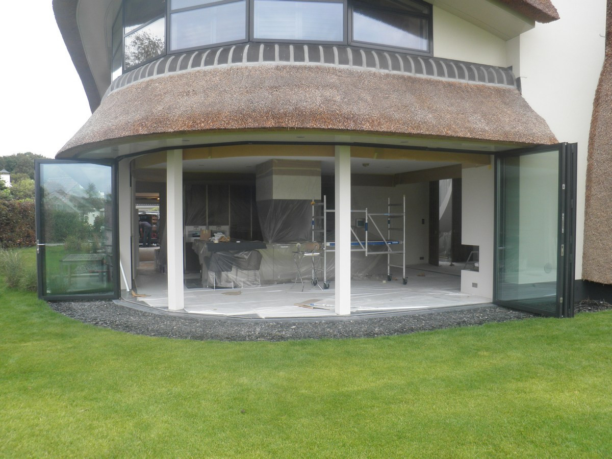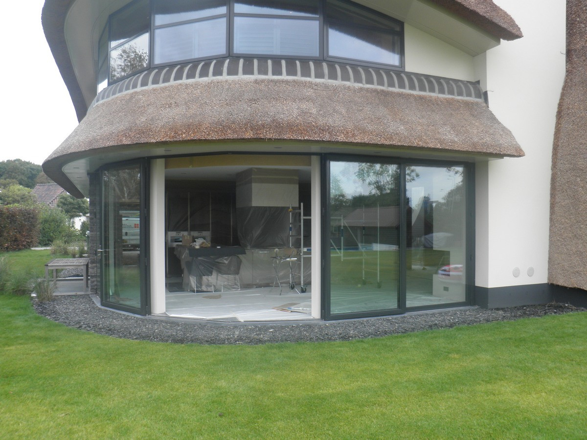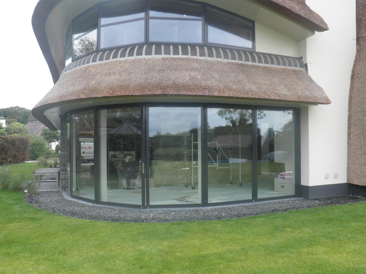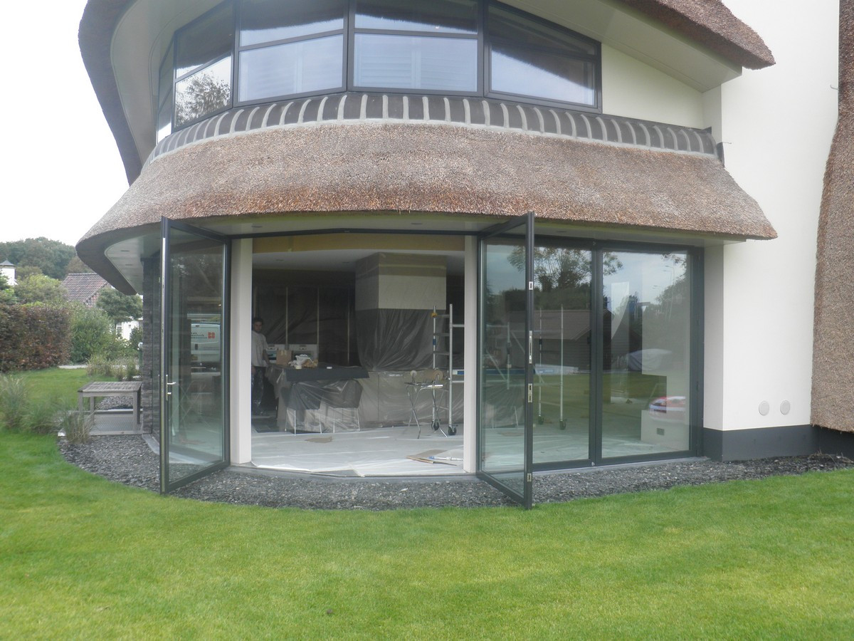 Deze ronde vouwpui bestaat niet uit gebogen glasstukken maar rechte glasstukken. Om kiervorming tussen de rechte glasstukken te voorkomen hebben we wederom een eigen ontworpen profiel gemaakt uit bestaande profielen. Op het oog lijkt het een simpele vouwdeur, maar als alles moet voldoen aan de juiste kwaliteitseisen, wind-, en waterdichtheid, kom je er achter dat dit nog nooit eerder is gemaakt. Alles bij dit kozijn is maatwerk. Naast de profielen zijn ook de hardstenen onderdorpel en de bovengeleiding met loopwagens speciaal voor dit project ontworpen.